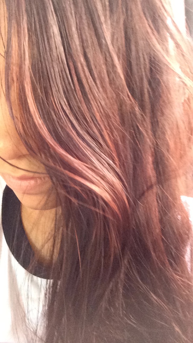 Eu tinha ombré hair + luzes, até que decidi pintar de preto (pior escolha. Não saiu totalmente até hoje!) pois tinha enjoado do meu cabelo. Com o tempo, a tinta preta foi desbotando do meu cabelo e se tornou algo acobreado, meio que iluminado.